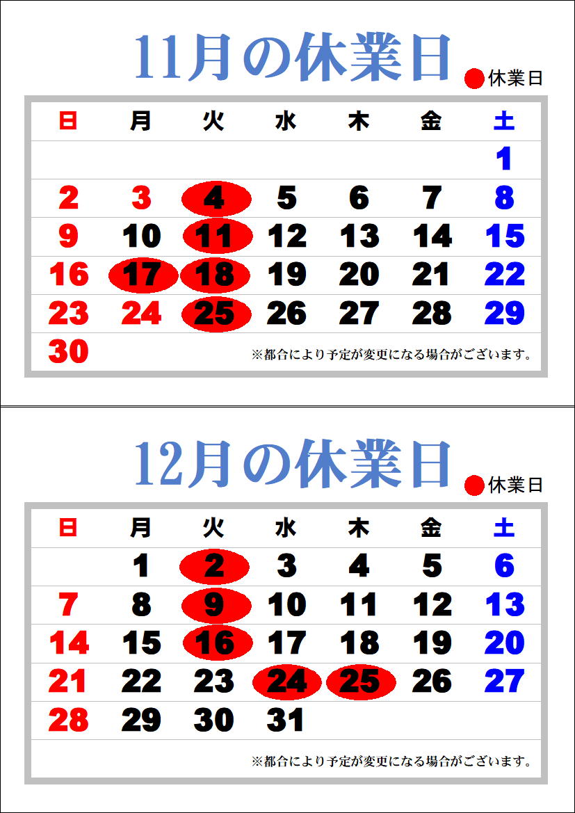 11月12月の休業日クリック拡大